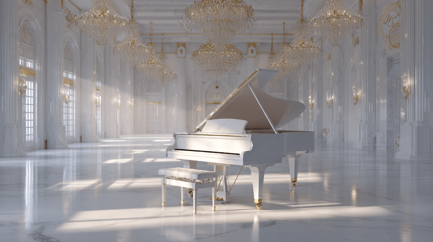 Sim. Um piano. De cauda. Branco. E um pianista, vestido a rigor, tocando. Sem parar. Tocando. Tocando. Tocando.